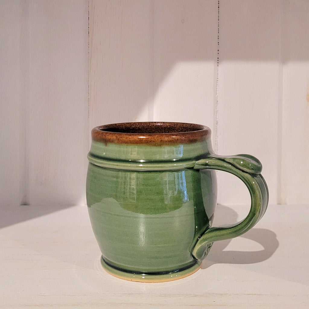 Ceramic "barrel" mugs by Kettle Hill Pottery. These mugs have a barrel shape and curved handle with a thumb rest. Made in Newfoundland and Labrador.